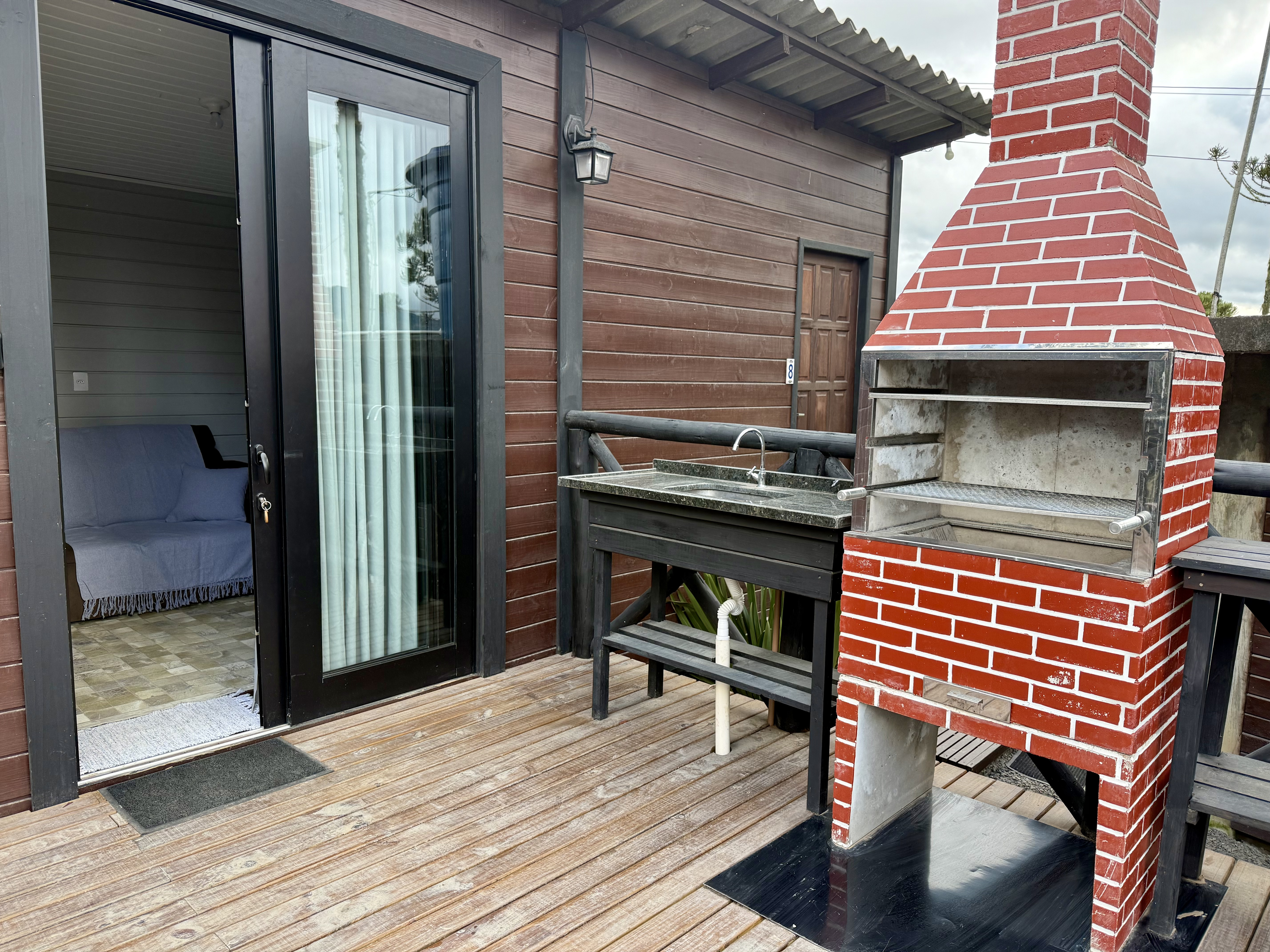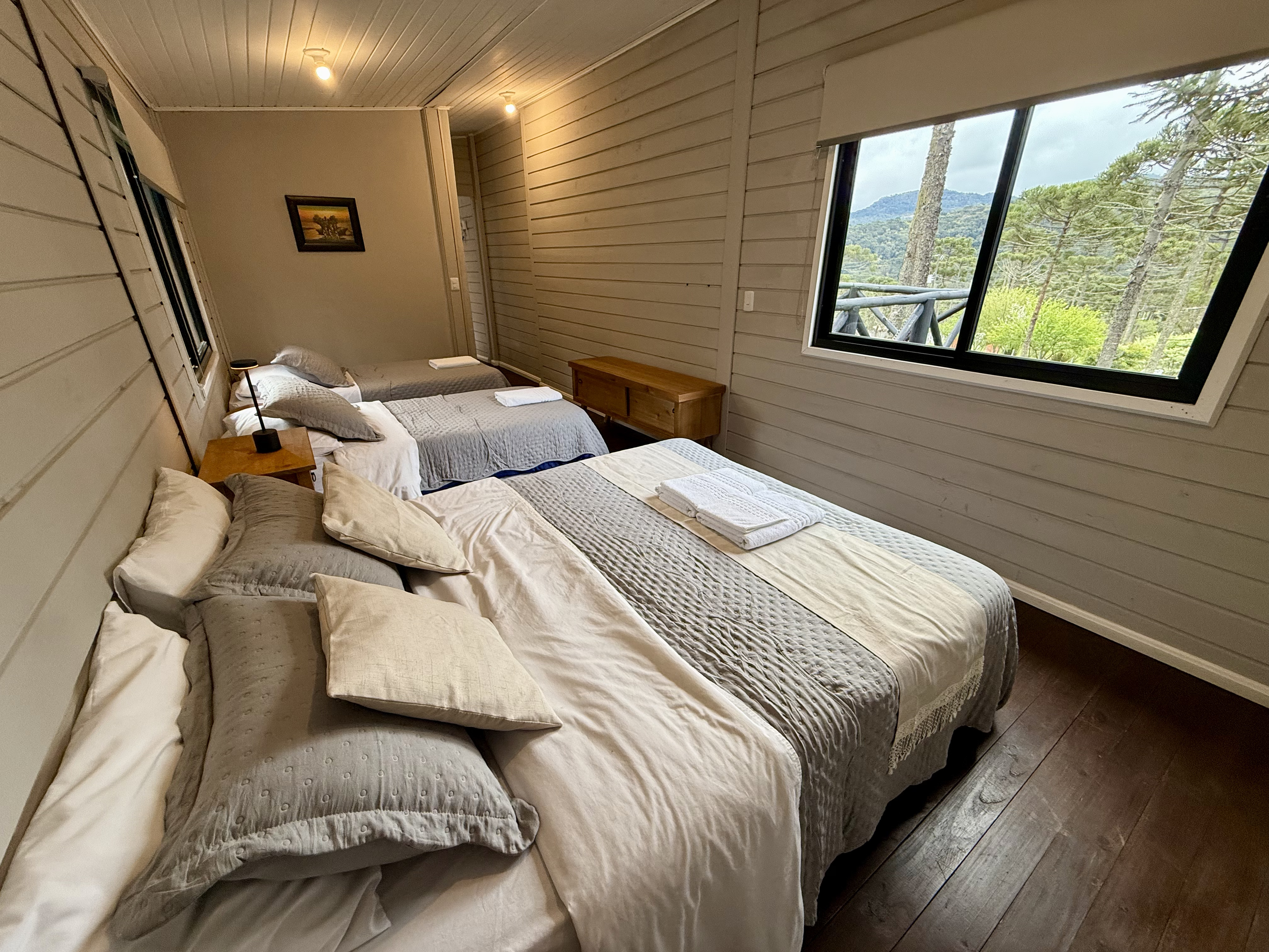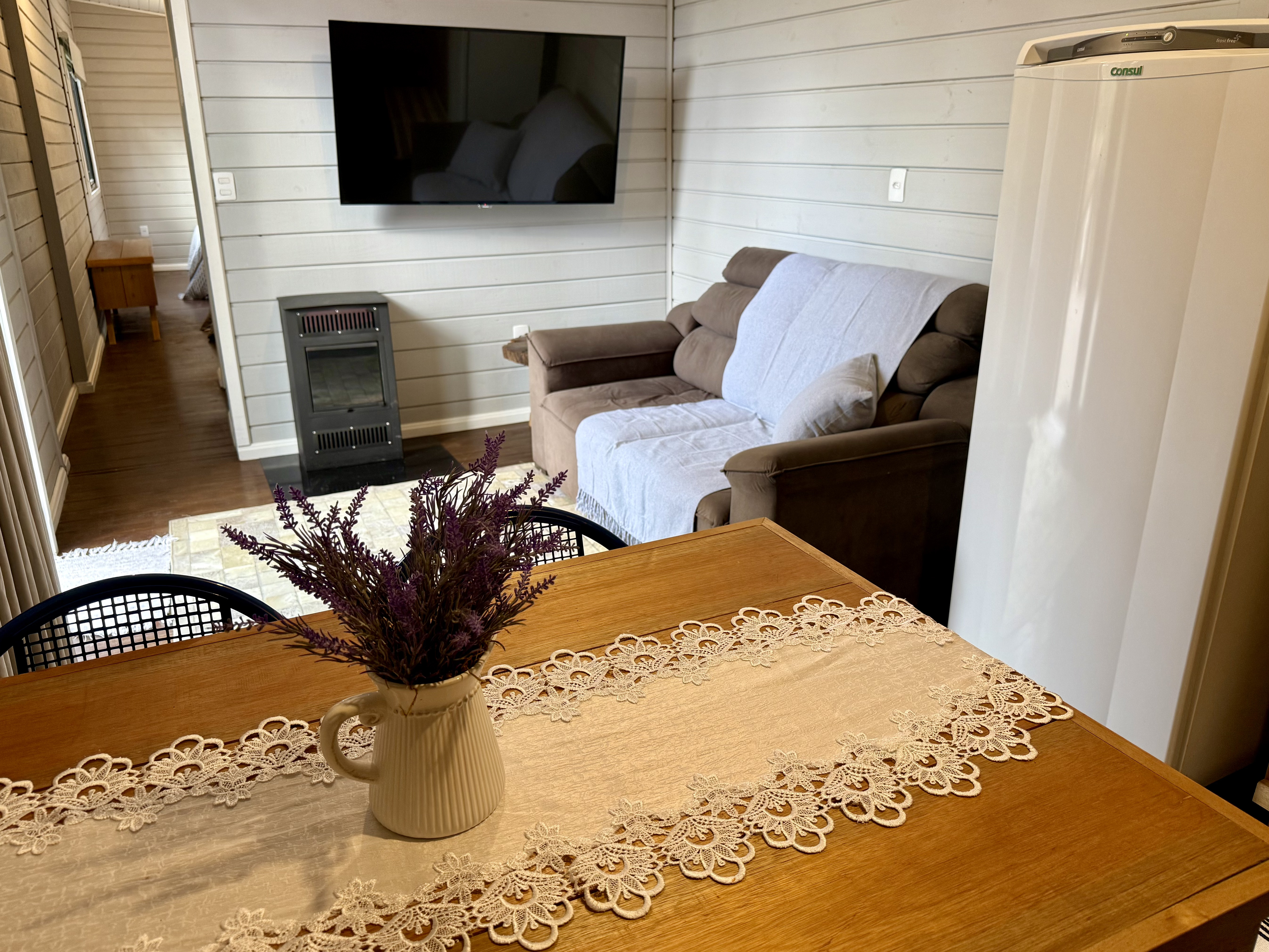 Chalé 08: 01 quarto com cama de casal + cama de solteiro. Lareira na sala. Cozinha.