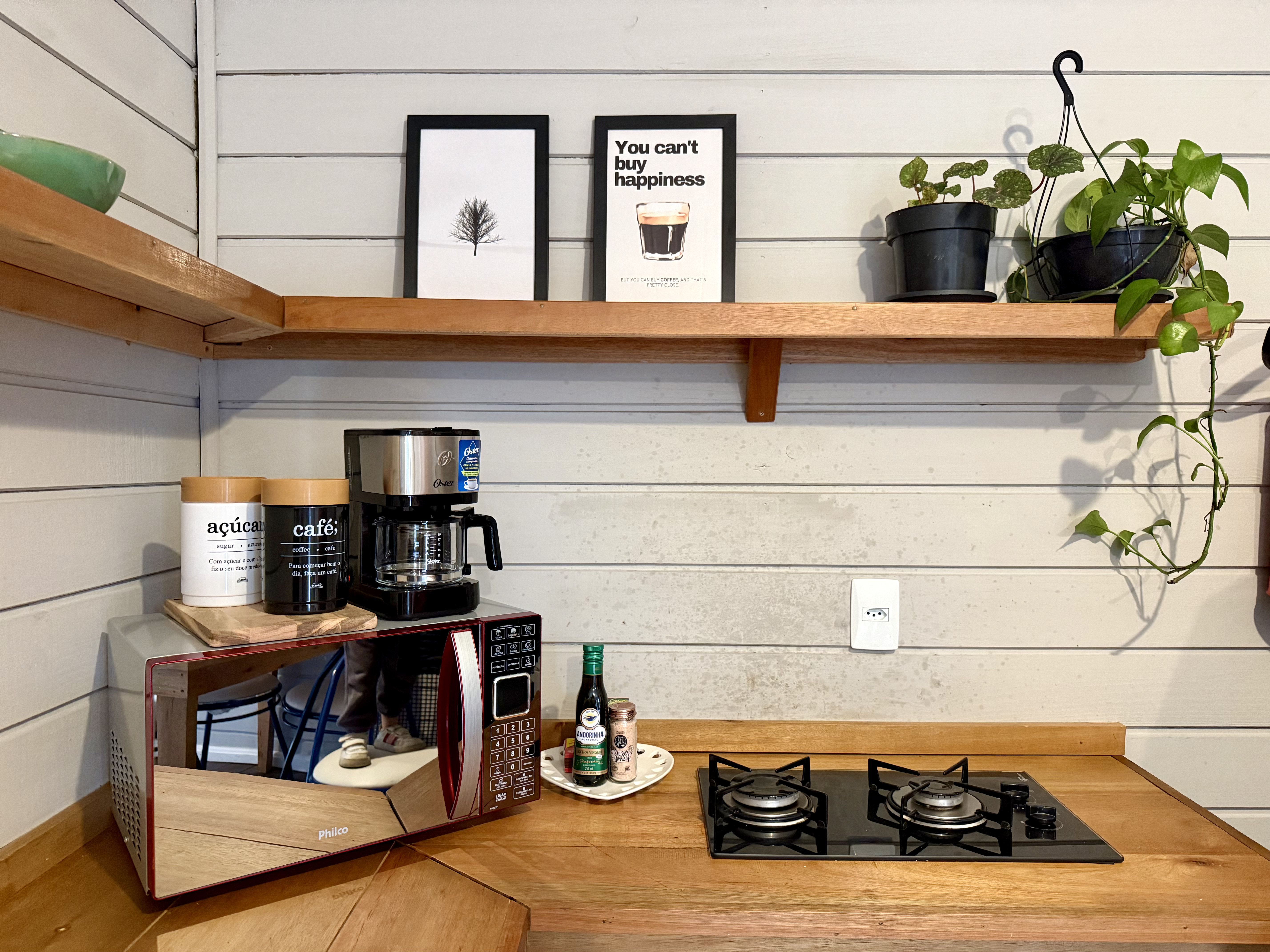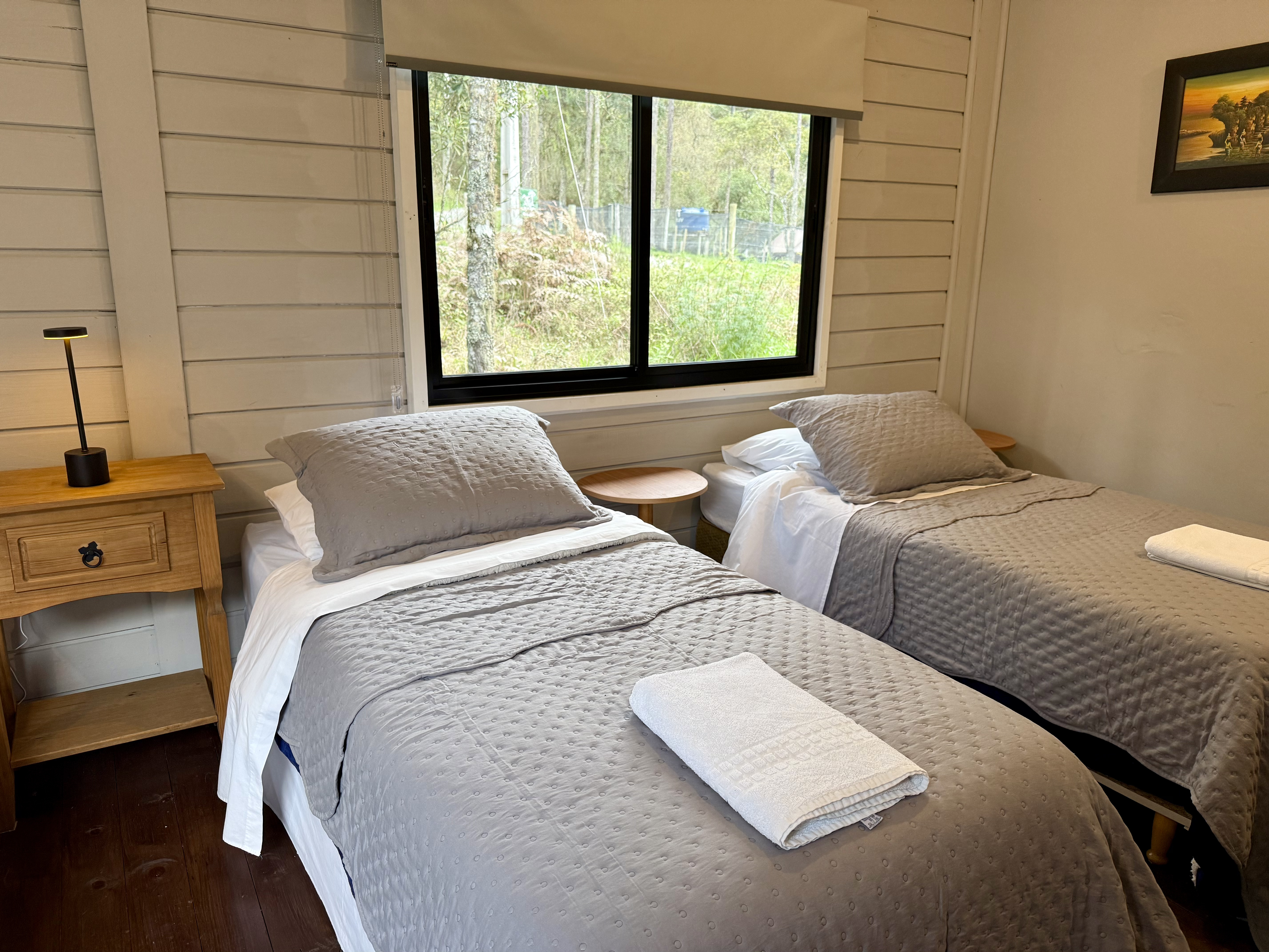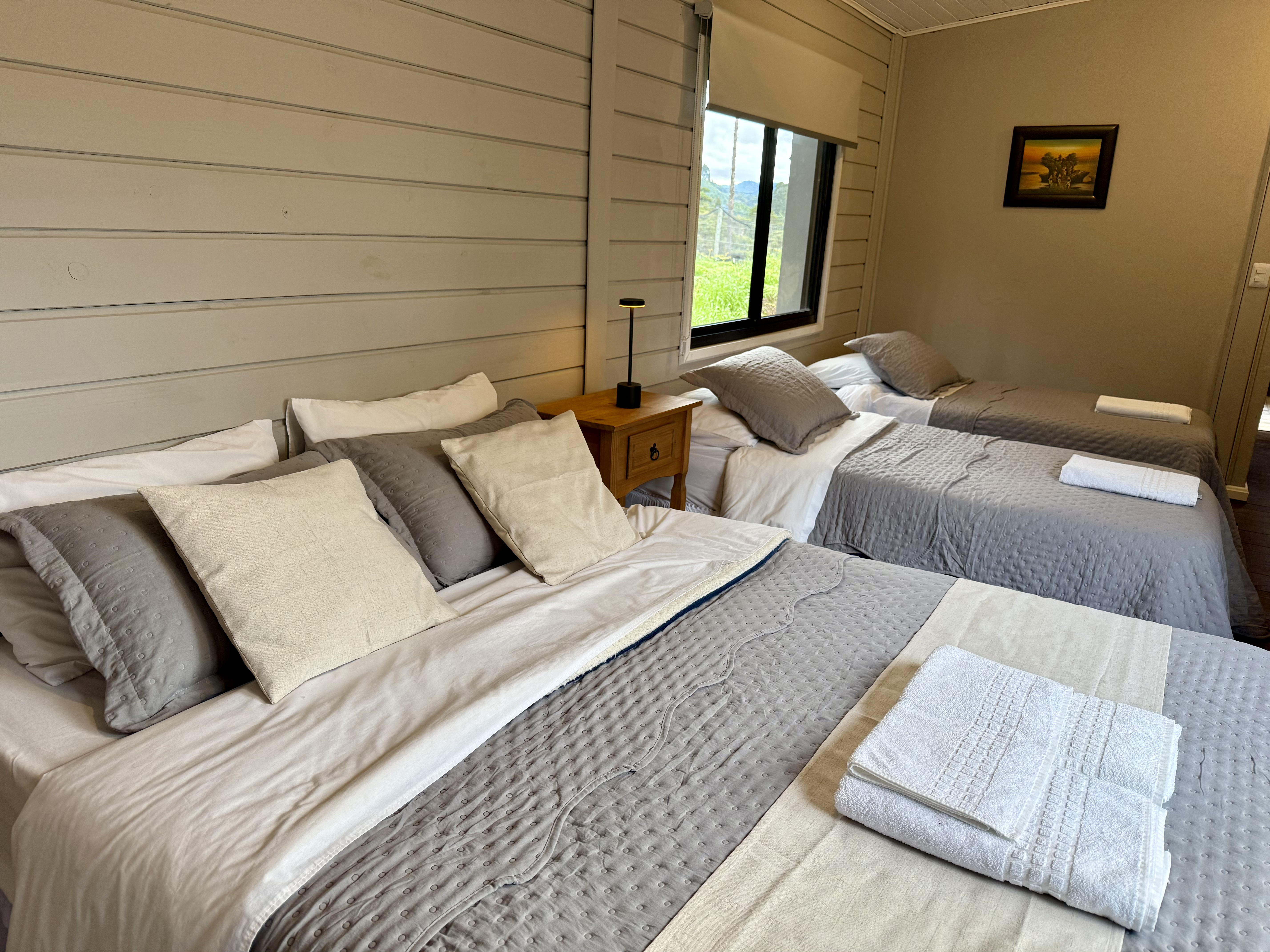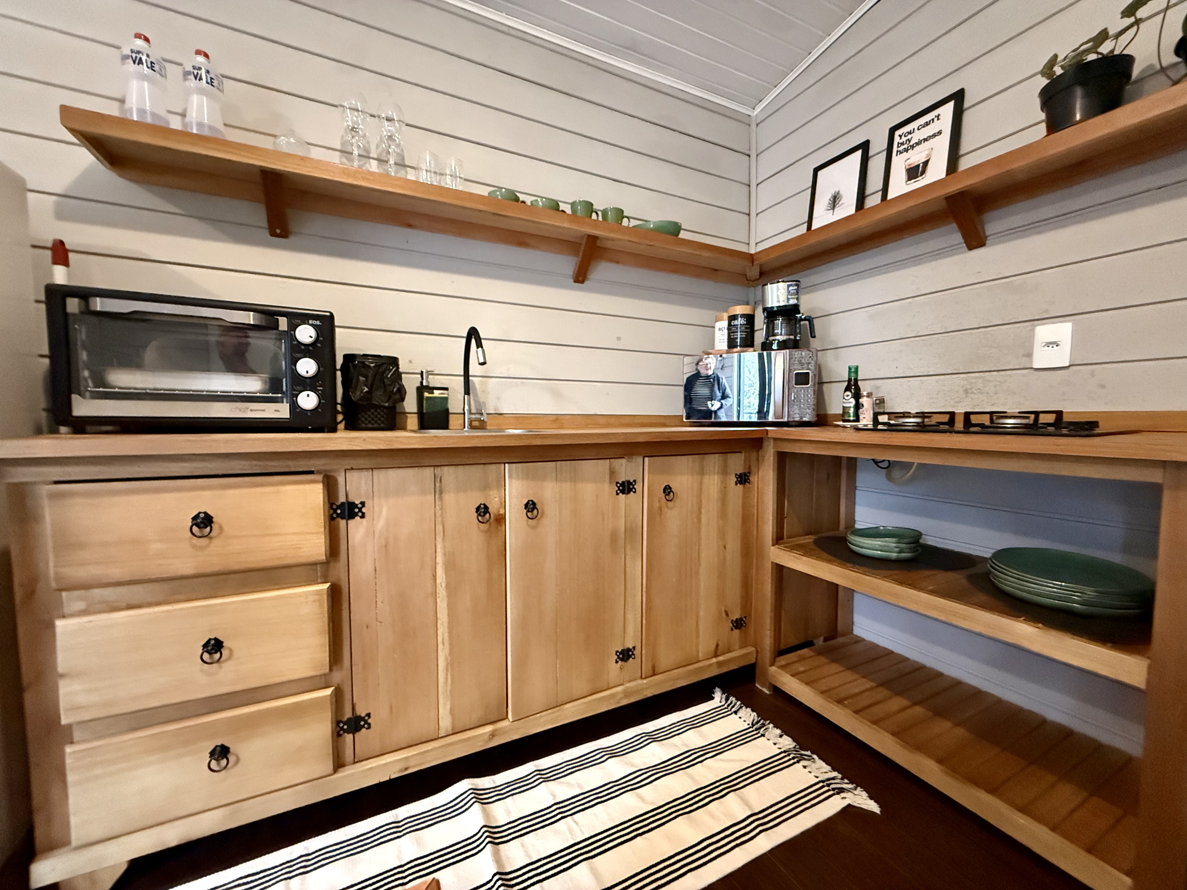 Chalé 08: 01 quarto com cama de casal + cama de solteiro. Lareira na sala. Cozinha.