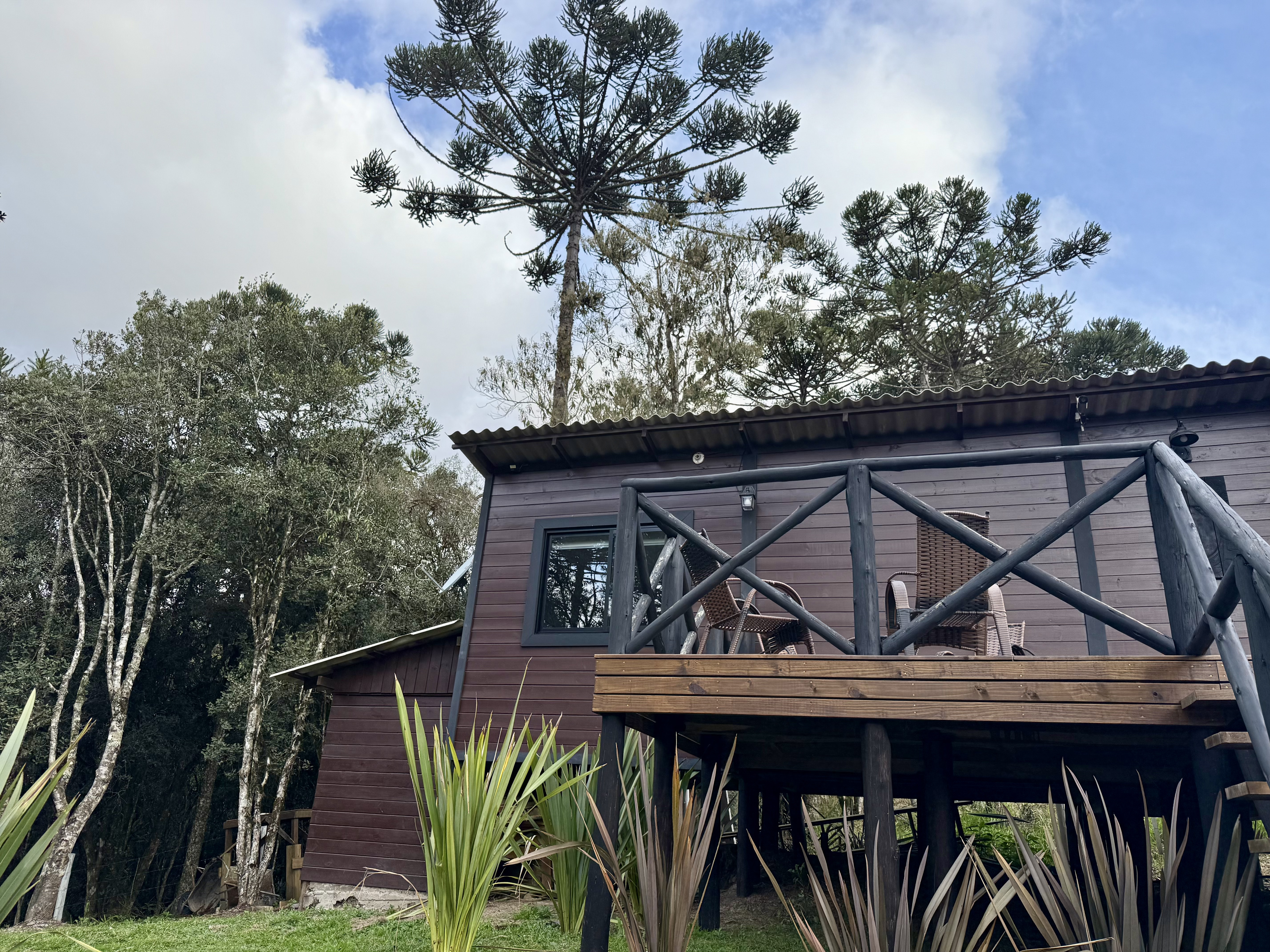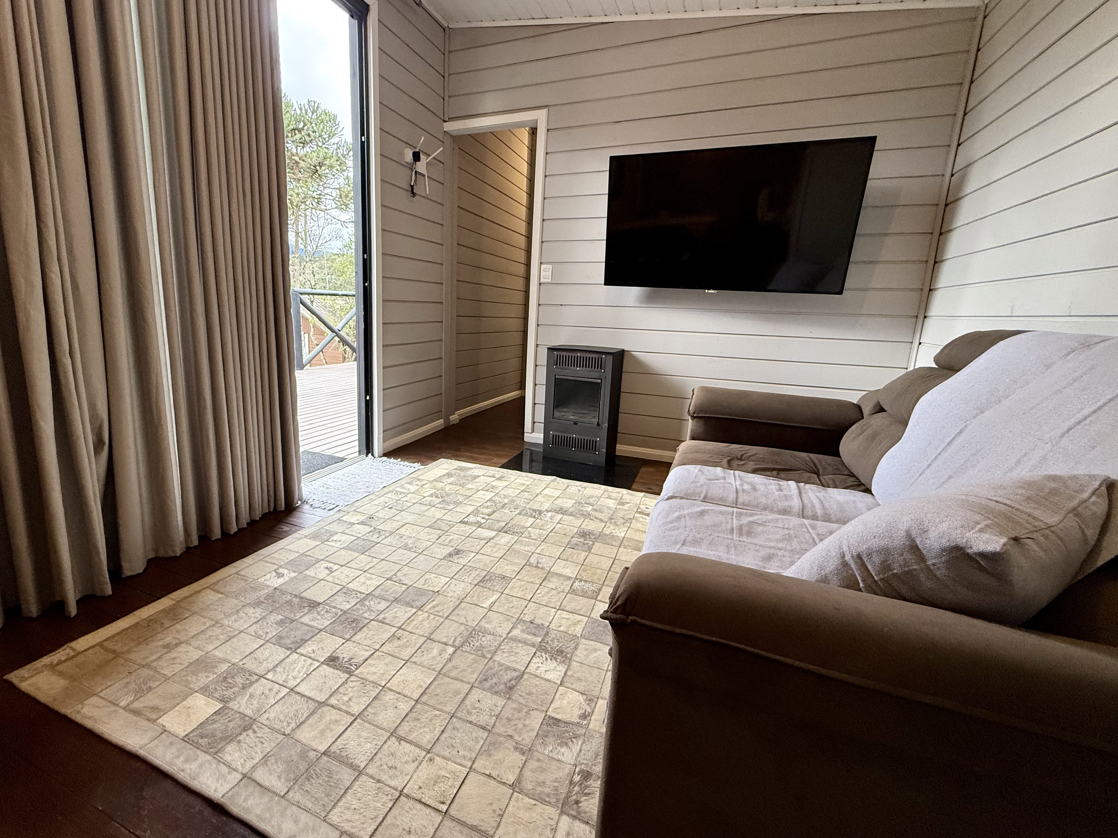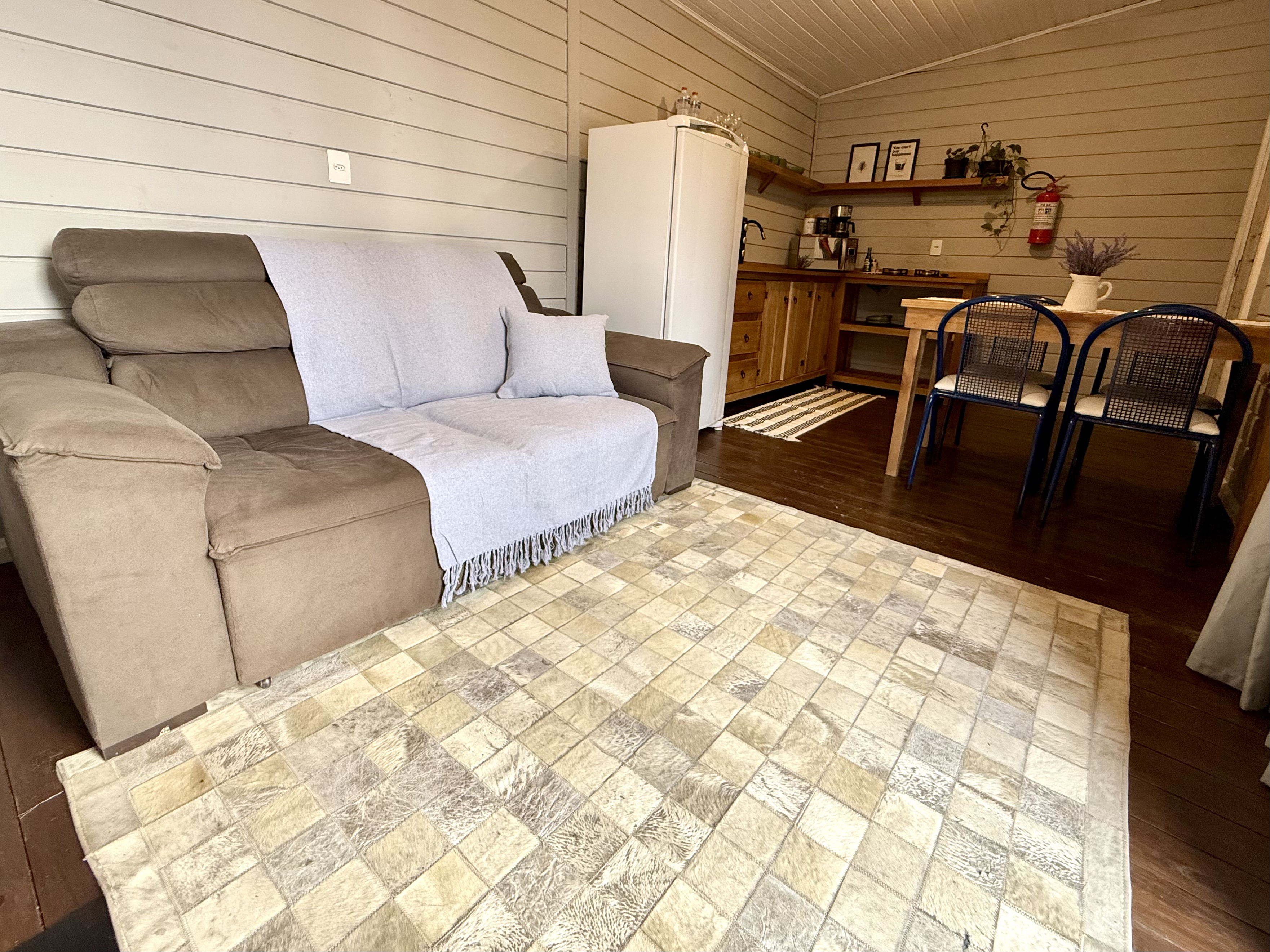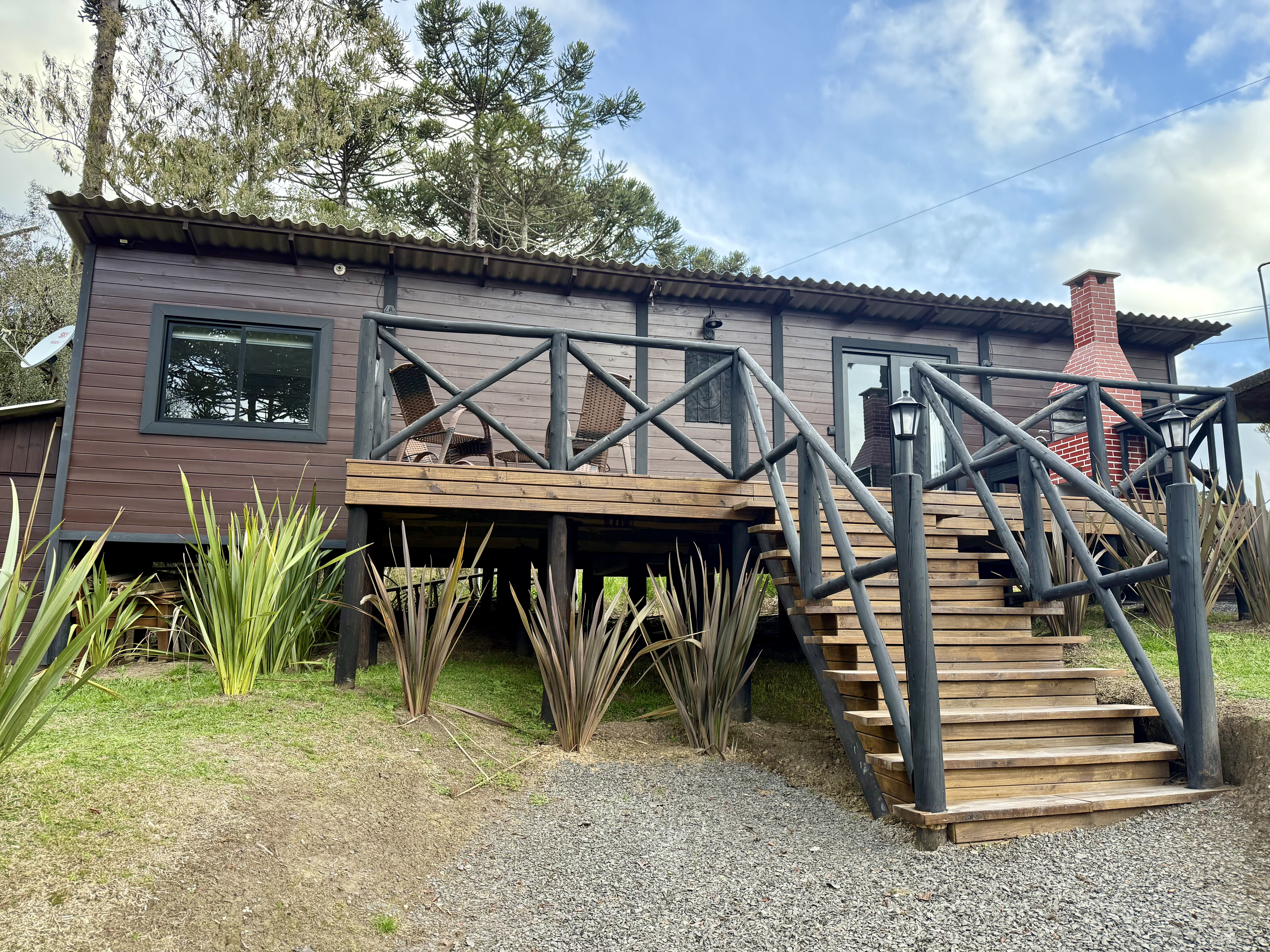 Chalé 08: 01 quarto com cama de casal + cama de solteiro. Lareira na sala. Cozinha.