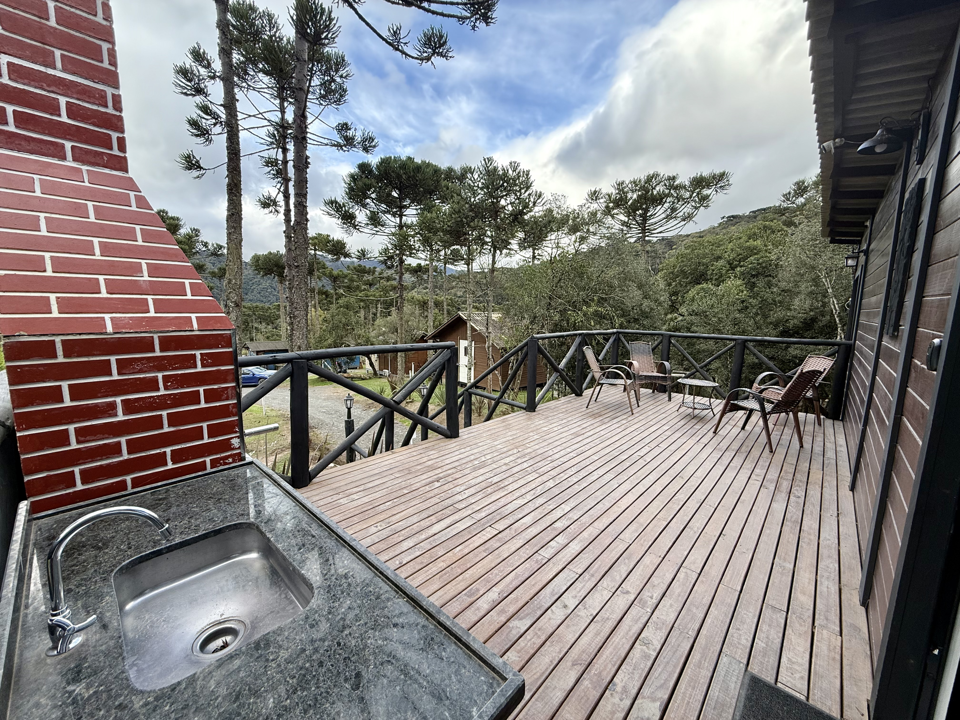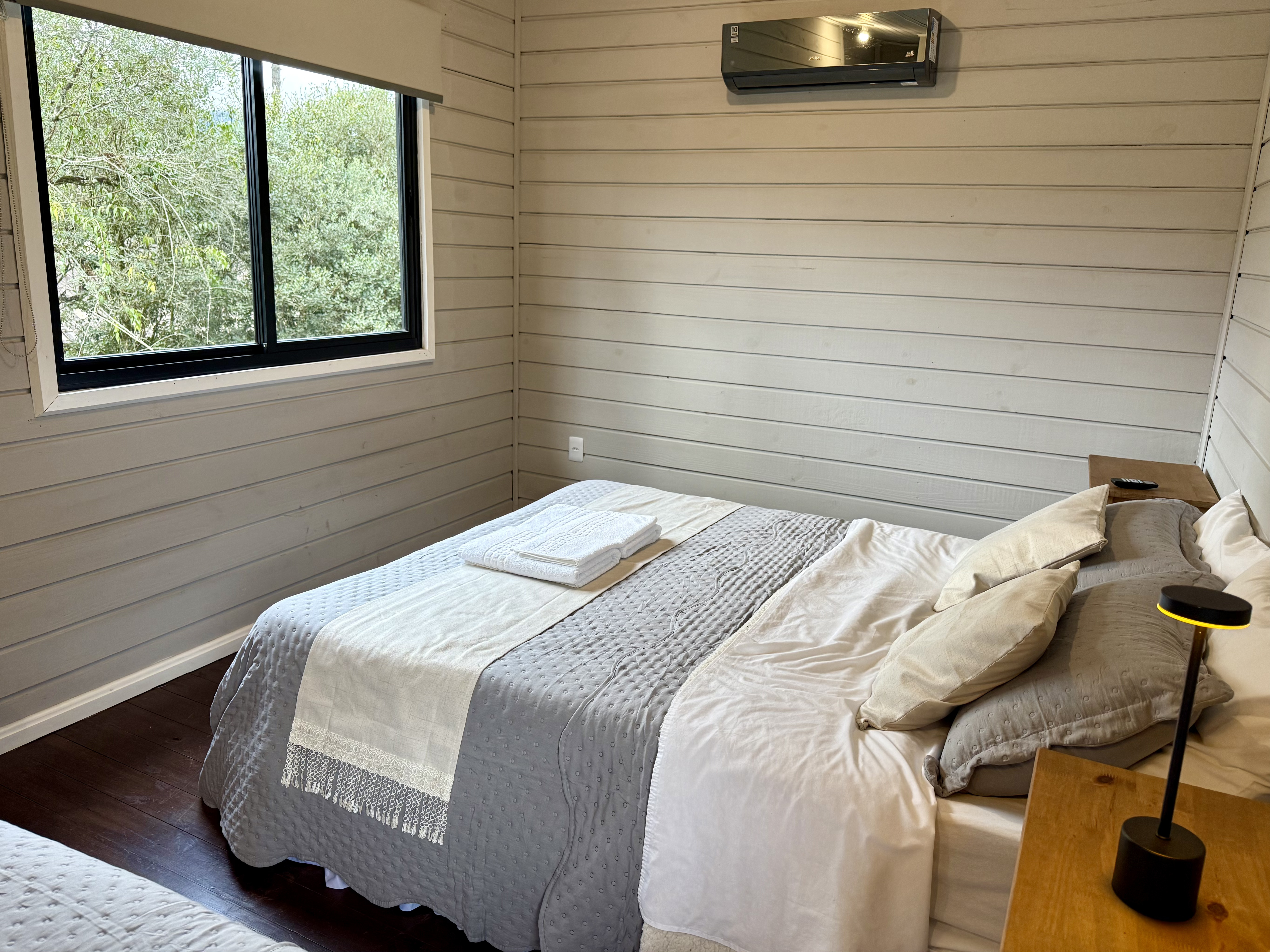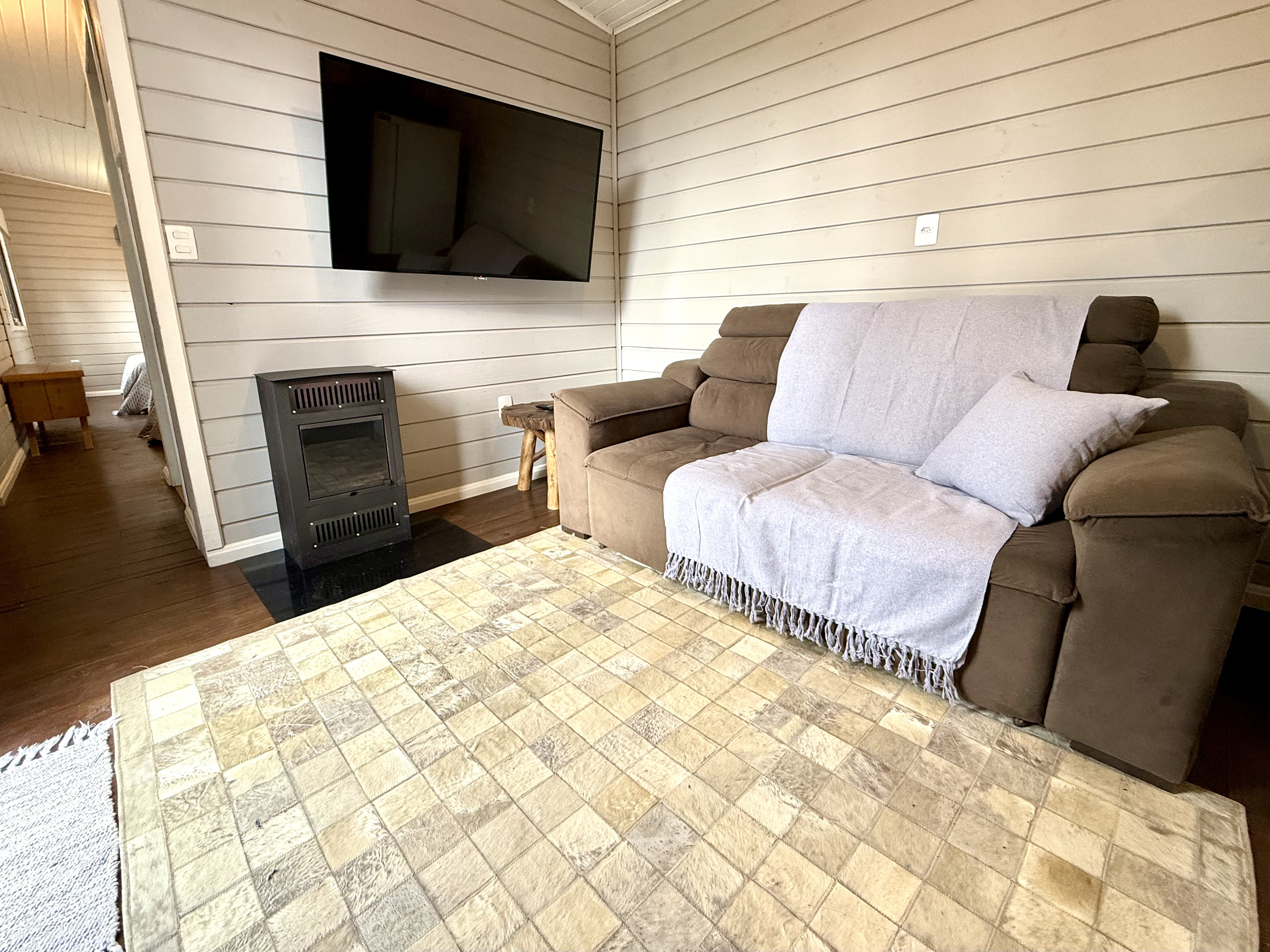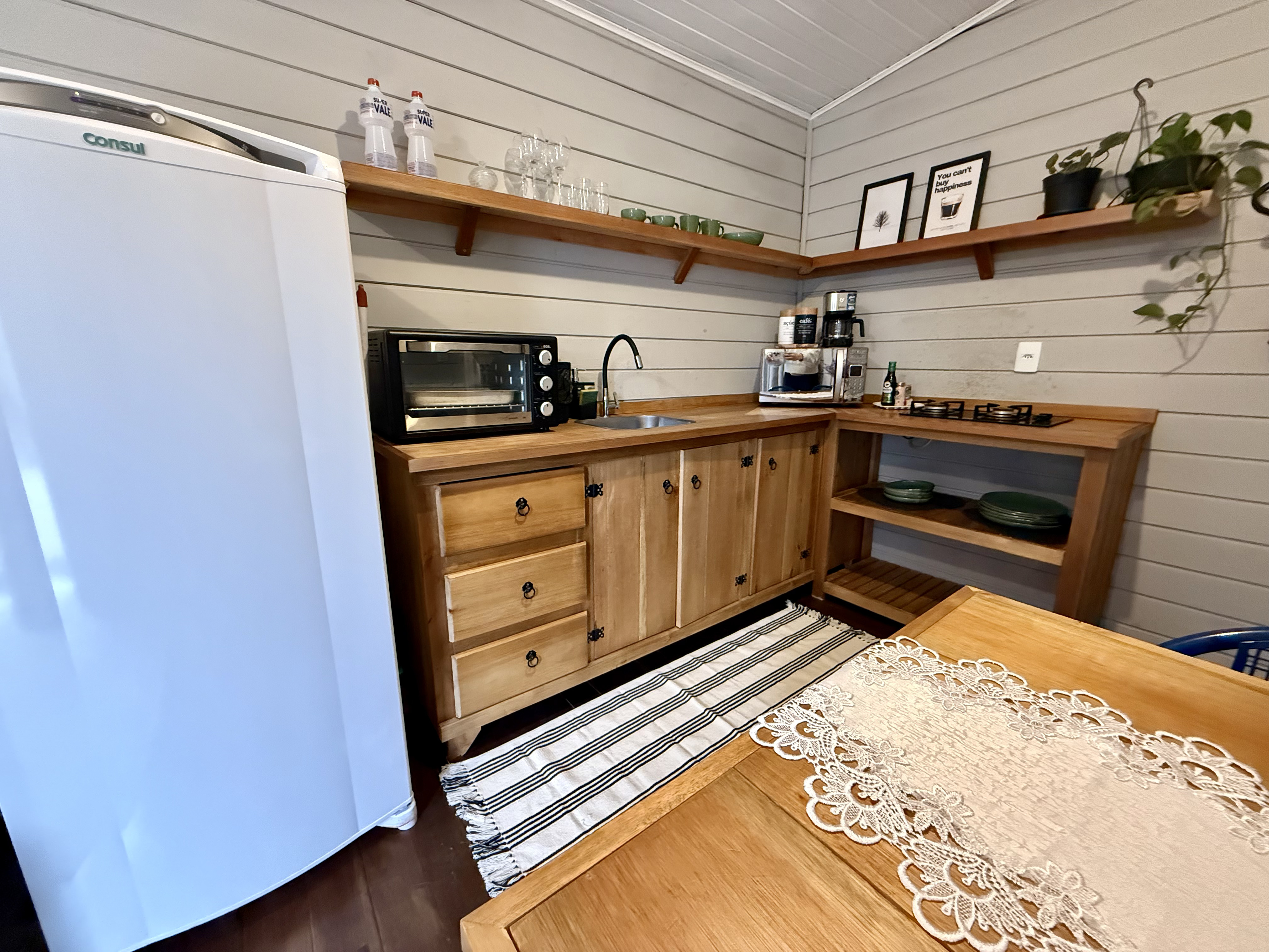 Chalé 08: 01 quarto com cama de casal + cama de solteiro. Lareira na sala. Cozinha.